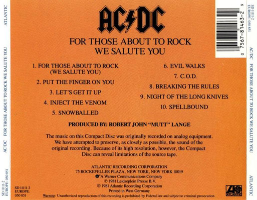 For Those About To Rock (Matrix 250851 @ 1) (CD Druck 250 851) (Cover Nummer 7567-81463-2 CA 835) (1987)